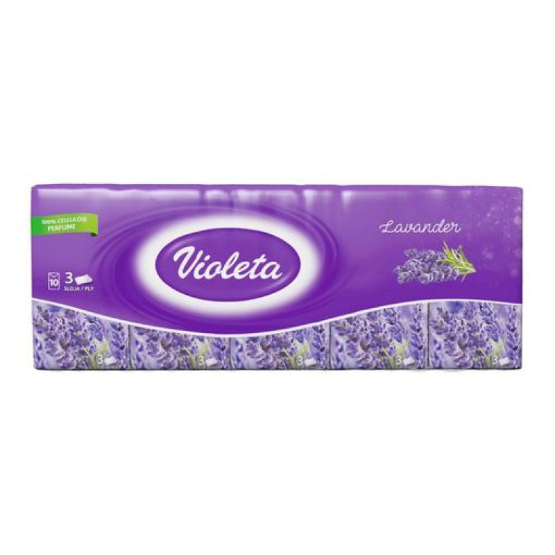 Violeta troslojne maramice proizvod su vrhunske kvalitete i modernog dizajna. Maramice mirisa lavande. Mekoća i nježnost karakterizira sve Violeta džepne maramice. Osjetljiva koža neće biti iritirana uslijed često neugodnih alergija i prehlada. Izrađene su od 100% celuloze dobivene iz obnovljivih izvora, dermatološki testirane te su u potpunosti sigurne u kontaktu s kožom.
