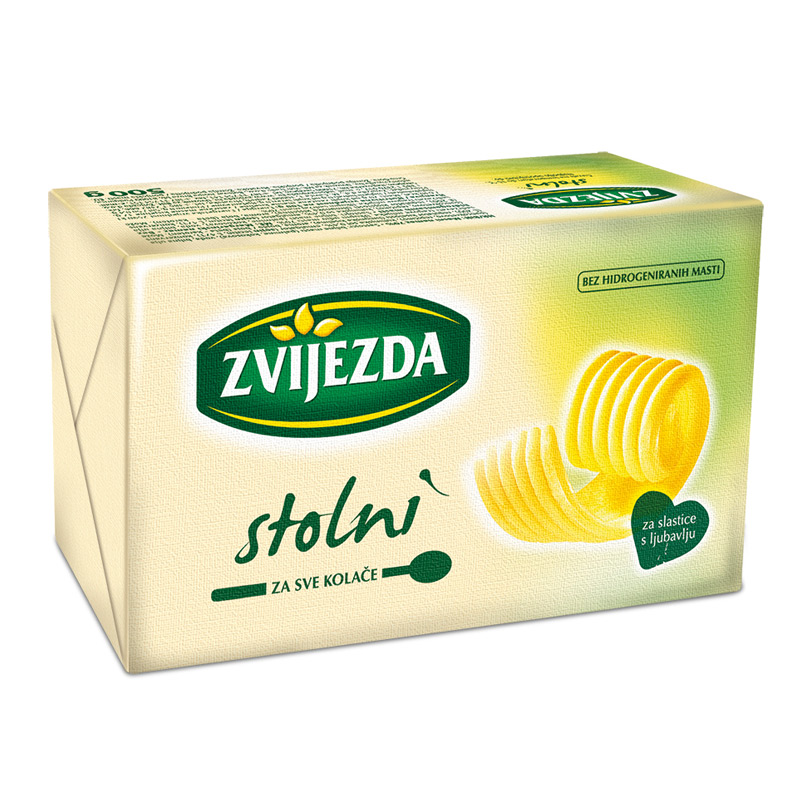 Masni namaz za kuhanje i pečenje. Kako bi kolači bili zamamni, da bi krema bila za prste polizati, a biskvit pravog volumena treba koristiti margarin provjerene kvalitete. Davne 1956. godine Zvijezdini su stručnjaci proizveli prvi margarin, a koji je i do danas ostao nezamjenjiva namirnica za kuhanje, pečenje, te izradu kolača i slastica. Zvijezda stolni izvrstan je i za pripravljanje slanih jela, umaka, temeljaca, preljeva ili nadjeva. Upotpunjuje svako jelo i čini ga ukusnijim naglašavajući njegove osnovne arome. Zvijezda stolni dobitnik je znaka Hrvatske kvalitete, koji nose hrvatski proizvodi koji po svim svojim značajkama posjeduju natprosječnu kvalitetu. Za kuhanje i pečenje. Proizvod tradicionalne Zvijezda kvalitete. Dobitnik znaka Hrvatske kvalitete. Pakiranje: 500 g. Uvjeti čuvanja: na temperaturi do 15°C.