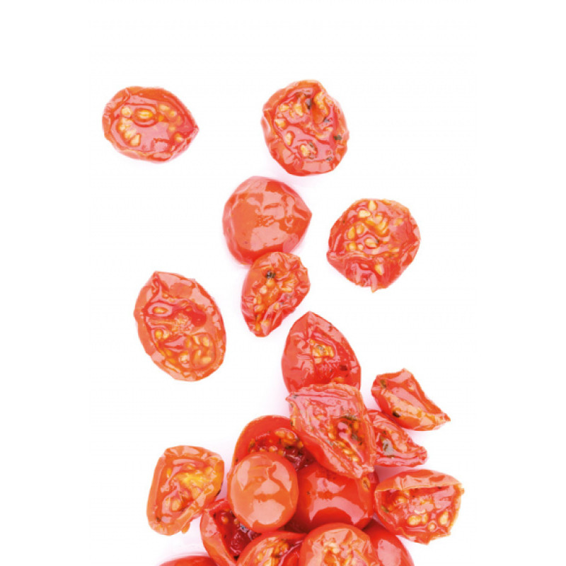 Sjajne crvene cherry rajčice s juga Italije, prepolovljene i djelomično sušene u pećnici, a zatim začinjene prirodnim biljem i maslinovim uljem dat će dodatnu aromu svakom receptu.